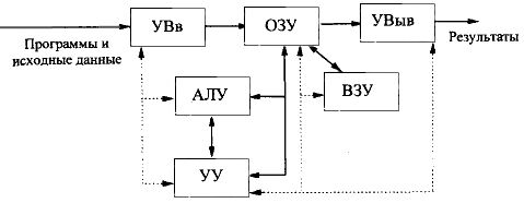 Схема ЭВМ, отвечающая программному принципу управления, логично вытекает из последовательного характера преобразований, выполняемых человеком по некоторому алгоритму (программе). Обобщенная структурная схема ЭВМ первых поколений представлена на рис. 1.