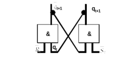 По данной зависимости можно построить схему элемента памяти асинхронного RS триггера. У этих триггеров есть недостаток, отсутствие блокировки запрета. Схемы с блокировкой с помощью & элементов называются синхронными RS триггерами и их модификации T, JK, D триггеры.