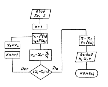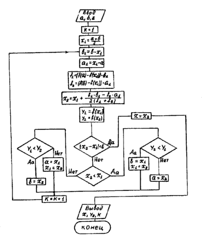 На рисунке представлена блок-схема метода парабол, в которой итерационный процесс заканчивается как только абсциссы вершины последующей и предыдущей параболы разнятся менее, чем на