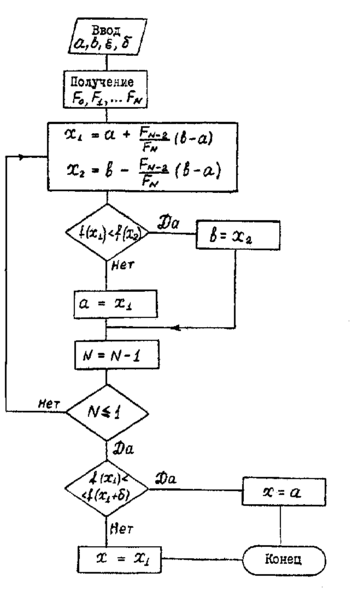 Дальнейшая процедура уменьшения отрезка неопределенности совпадает с методом дихотомии. Итак, основное отличие метода Фибоначчи от метода дихотомии состоит в выборе точек