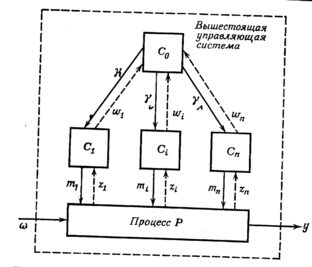 На рис. 8 представлена блок-схема некоторой двухуровневой системы. Отдельные блоки изображают подсистемы, а их взаимное расположение отражает иерархическую структуру всей системы. Система, изображенная на рис. 8, имеет (n+2) основных подсистем: вышестоящую систему С0 n нижестоящих управляющих систем С1 … Сn и управляемый процесс P. отметим два вида вертикального взаимодействия между подсистемами. Один – это передача вниз «командных» сигналов; сигналы от нижестоящих управляющих систем С1 … Сn к процессу будут называться управляющими воздействиями (входами), тогда как сигналы от вышестоящих к нижестоящим управляющим системам будут называться координирующими сигналами (входами) или вмешательствами. Другой вид вертикального взаимодействия – это передача наверх информационных сигналов, или сигналов обратной связи, различным управляющим системам иерархии. Эти передачи сигналов представлены на блок схеме пунктирными линиями.