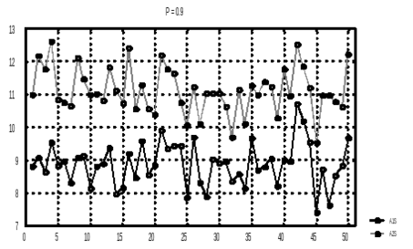 Испытаем интервал (5) на 50 выборках объема n=10 для трех уровней доверия РД : 0.9 , 0.99 , 0.999 (соответственно, три значения fp) .
