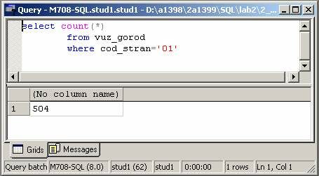 select count(*) from vuz_gorod where cod_stran='01' [F5]