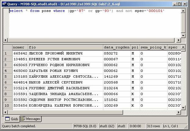 select fio from poss where kat_obuch_k between '03' and '04' [F5]