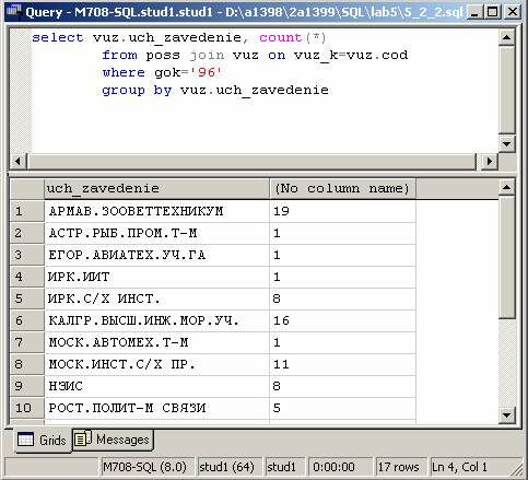 Этот запрос выполняется аналогично запросу первого варианта, за исключением того, что в отчете необходимо выдать значения атрибута (названия учебных заведений), не принадлежащего структуре таблицы poss. Другими словами, в этом запросе необходимо в предложении where (условии выборки) добавить условие соединения двух таблиц (poss и vuz) по полю код учебного заведения, в предложении from имя таблицы vuz, а в списке выборки и в предложении group by указать составное имя для поля название учебного заведения (с именем таблицы).