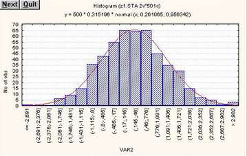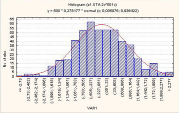 Моделирование. Проиллюстрируем этот пример статистически, с помощью пакета. Сгенерируем две выборки объема n = 500 в соответствии с гипотезами Н0 и Н1. Для обеих выборок построим гистограммы (в диапазоне от -2.5 до 2.5 с 20 интервалами) и убедимся, что “на глаз” различие не заметно. Определим сумму наблюдений по каждой выборке и применим решающее правило (5) с порогом (6). Убедимся, что в обоих случаях решающее правило дает правильное решение.