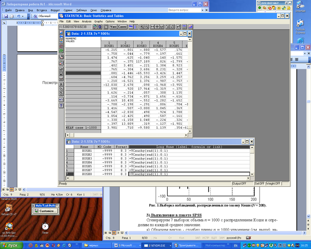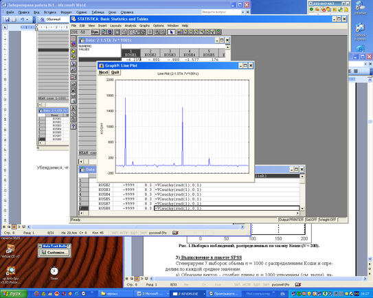 распределена по (3), а функция распределения для (3) есть arctg x). Эта вероятность, как видно, не стремится к 0 с ростом n. Например, если = 0.03, то вероятность выполнения (4) равна приближенно P 0.98, т.е. событие (4) практически достоверно, и можно уверенно ожидать его выполнения с одного раза. Если =1, то вероятность (4) равна 0.5, и выполнение его хотя бы раз можно уверенно ожидать, проделав 7 экспериментов (т.к. вероятность невыполнения ни разу равна (0.5)7 = 1/128). И это при любом фиксированном n, например, n = 1000. Проверим это экспериментально.