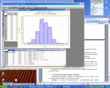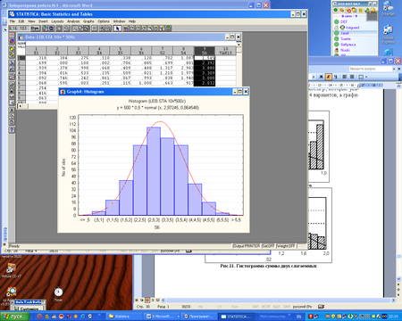 чтобы статистически оценить закон распределения для суммы S, cследует многократно, N раз (например, N=500), промоделировать суммирование: получим S1, S2,...,SN - выборку для суммы; для этой выборки построим гистограмму и сравним ее визуально с нормальной плотностью.