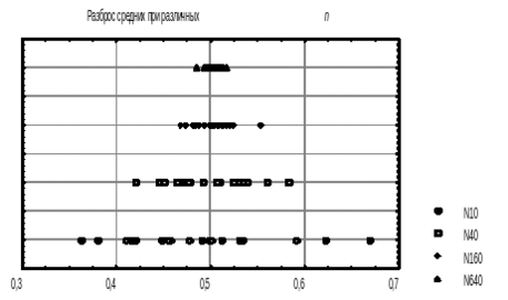 4. Действия повторяем для n = 40, 160, 640. Результаты заносим в табл.1, вычисляем размах и убеждаемся, что с ростом n разброс средних уменьшается (распределение сжимается).