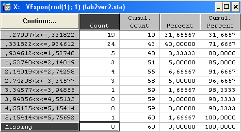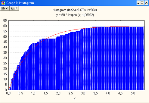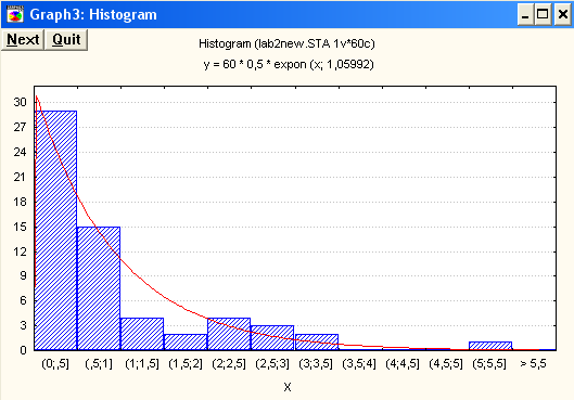 Сгенерируем выборку (=VExpon(rnd(1); 1) для E(2) со средним 1/1=1) и посмотрим ее графически