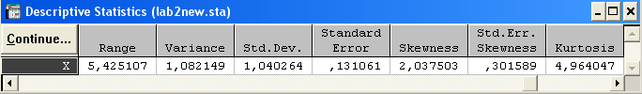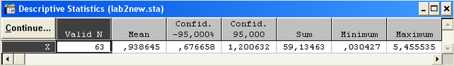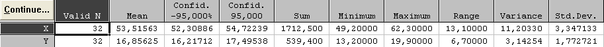 получаем таблицу с характеристиками: mean (среднее), Confid 95% (доверительные границы нижняя и верхняя с уровнем доверия 0.95), Sum (сумма), Minimum, Maximum, Range (размах), Variance (дисперсия), Std. Dev. (стандартное отклонение) и др.