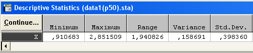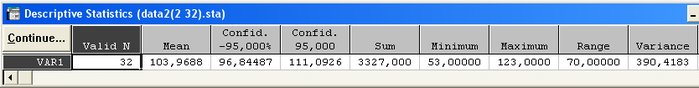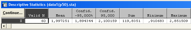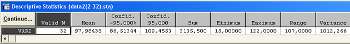 mean (среднее), Confid 95% ( доверительные границы нижняя и верхняя с уровнем доверия 0.95 ), Sum ( сумма ), Minimum, Maximum, Range ( размах ), Variance ( дисперсия ), Std. Dev. ( стандартное отклонение)