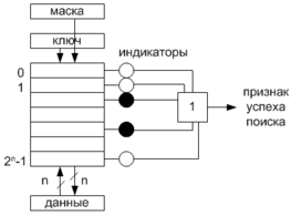 Возможно выполнение процедур: 1) считывание (например, извлечь все слова, для к-рых успешный поиск, найти 1-е найденное слово), 2) запись (считывается ячейка, отвечающая критерию поиска, затем записывается). Если в маске все 1, то отмечаются все ячейки. Манипулируя формой маски можно выполнить запись в любую ячейку.