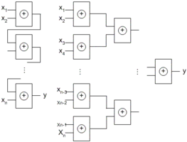 Свертка – суммирование компонент вектора по модулю 2 (проверка по четности). Возможны 2 схемы – линейная и пирамидальная.