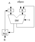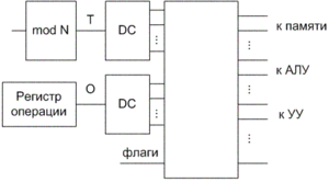 Выполнение последовательности команд сводится к периодическому выполнению определенных этапов. Используется счетчик тактов (по модулю ). Не все команды выполняются по одной жесткой схеме (команды чтения, записи, перехода и т.д.), поэтому небор управляющих сигналов зависит от состояния управляющего устройства (от значения счетчика) и от источника операции.