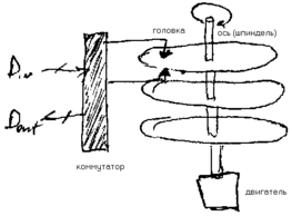 Запоминающая поверхность в рабочем состоянии вращается и ее участки периодически входят в контакт со считывающией/ записывающей головкой. Общая схема: