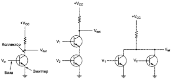 Базовым элементом для построения логических схем является транзистор. Транзистор может работать как очень быстрый бинарный переключтель. Содержит коллектор, базу и эмиттер. Если входное напряжение низкое (0), то транзистор выключается и действует как очень большое сопротивление, и выходное напряжение получается высоким (1). Если входное напряжение высокое (1), то транзистор включается и действует как проводник, вызывая заземление входного сигнала (0). Т.о. отдельный транзистор работает как инвертер.