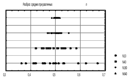 4. Действия повторяем для n = 40, 160 и 640. Результаты заносим в таблицу, аналогичную табл.1. Из таблицы результатов видно, что разброс среднеарифметического