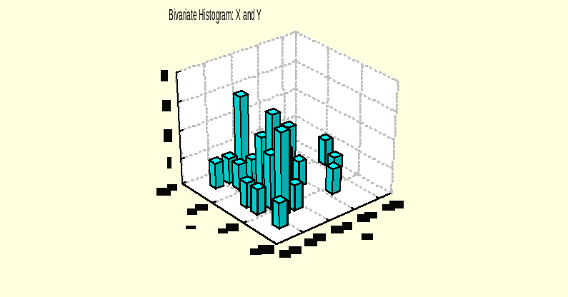 Graphs - Stat 3D Sequential Graphs - Bivariate Gistogram - установим по осям X и Y требуемые переменные ( кнопкой Variables ), зададим число интервалов по каждой оси - OK.