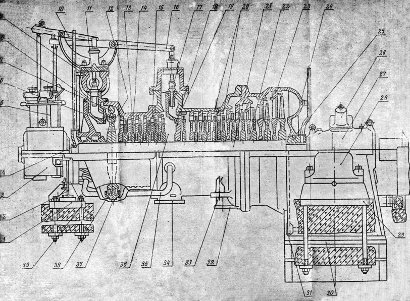 Рис. 2.2. Продольный разрез турбины № 1: 1— передняя фундаментная плита; 2 —гибкая опора; 3 — корпус переднего подшипника; 4 — переднее концевое уплотнение; 5—блок регулирования; 6 —сегмент сопл; 7 — направляющий аппарат регулирующей ступени; 8 — сопловая коробка; 9—клапанная коробка; 10 — рычажный привод регулирующих клапанов ЧВД; 11 — регулирующий клапан ЧВД; 12 — двухвенечное рабочее колесо; 13—передняя часть корпуса; 14 — одновенечное рабочее колесо; 15 — сварная диафрагма; 16— рычажный привод регулирующих клапанов ЧНД; 17 — регулирующий клапан ЧНД; 18 — средняя часть корпуса; 19 — сопловая коробка ЧНД; 20 — уплотнительные козырьки; 21 — вал; 22—расточка под обойму диафрагменного уплотнения; 23 — чугунная диафрагма; 24 — выхлопной патрубок; 25 —заднее концевое уплотнение; 26 — валопоуоротное устройство; 27 —корпус заднего подшипника; 28 — опорные лапы ЧНД; 29 — рундаментная плита; 30 — фланец для крепления переходного патрубка к конденсатору; 31 — подвод пара от регулятора уплотнений; 32 — патрубок отбора пара на подогреватель низкого давления; 33 — патрубок отбора пара на деаэратор; 34 — патрубок промышленного регулируемого отбора 35 — перепуск пара из переднего уплотнения; 36 — камера промышленного отбора; 37 — дренаж из камеры регулирующей ступени; 38 — паровой щит; 39 — полуфланец крепления кор пуса переднего подшипника