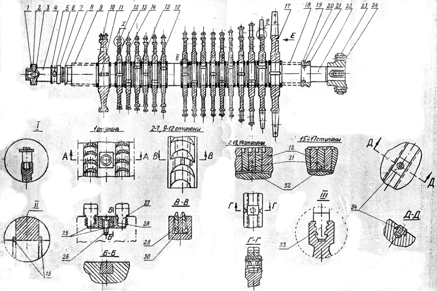 Рис. 2.6. Ротор турбины № 1: 1 — рабочее колесо насоса (оно же — гребень упорного подшипника); 2 — обтекатель масляного насоса; 3 — стопор обтекателя; 4 — шейка переднего опорного подшипника; 5 — маслоотбойный гребень; 6 — бойковое устройство; 7 — гребеиь реле осевого сдвига; 8 — пароотбойный гребень; 9 — усики переднего лабиринтового уплотнения; 10 — диск регулирующей ступени; 11—шпонка диска; 12 — рабочие лопатки; 13—разгрузочные отверстия; 14 — диск ступени давления; 15 — кольца, фиксирующие диски; 16 — проточки под диафрагменными уплотнениями; 17—проточки для балансировочных грузов; 18 — усики заднего лабиринтового уплотнения; 19 — пароотбойный гребень; 20 — винт, стопорящий втулку; 21 — маслоотбойный гребень; 22 — шейка заднего опорного подшипника; 23— храповое колесо валоповоротного устройства; 24 — полумуфта соединительной муфты турбины и генератора; 25 — боковой клин замка первой ступени; 26 — винт, стопорящий замок; 27 — замковая лопатка первой ступени; 28 — вставка замка первой ступени; 29 — замковое промежуточное тело; 30 — замковый клин; 31 — штифты-заклепки; 32 — замковые лопатки 2—17-й ступеней; 33 — зубчиковый хвост лопатки; 34 — балансировочный груз