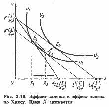 каким должен быть доход, чтобы при изменившемся соотношении цен обеспечить ему прежний уровень удовлетворения? проведем вспомогательную К'L', параллельную KL1 (отражающую новое соотношение цен), так, чтобы она касалась старой кривой безразличия U1U1 (т.е. обеспечивала бы прежний уровень удовлетворения). отметим E3 и Х3.