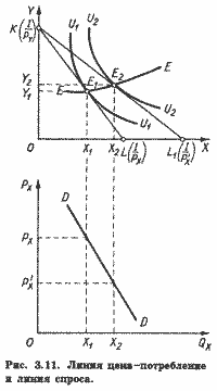 На основе EE можно построить линию индивидуального спроса. Покупает Х1 товара X при цене РX и X2 при цене Р'X, итд