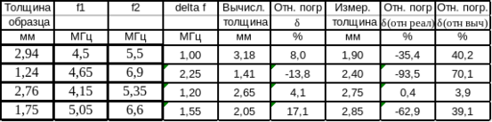 | Толщина, мм | f1, МГц | f2, МГц | f, МГц | Измеренная толщина, мм |