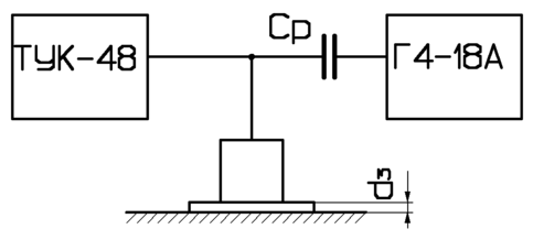 Для измерения частоты резонансных сигналов .используют Г4-1-8А, напряжение фиксированной частоты с которого подается через разделительный конденсатор Ср в контур ГКЧ. Частота Г4-18А отмечается на. экране в виде метки. Измерение значений резонансных частот производят путем совмещения на экране ЭЛТ прибора ТУК-4'В измерительной метки с каждым из (резонансных импульсов. Отсчет производят по шкале прибора Г4-18А.