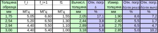 | Толщина, мм | fi, МГц | fi+1, МГц | f = f1, МГц | Измеренная толщина, мм |