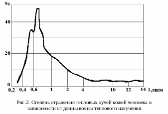 В определении оптимальных условий защиты от теплового излучения важное значение имеет характер его спектрального состава, так как материал экрана должен поглотить или отразить лучи, несущие максимум энергии. Как видно из рис.2 для организации эффективной защиты от теплового излучения необходимо устранить в лучистом потоке по возможности наибольший диапазон длинноволнового излучения, которое хорошо поглощается поверхностью кожи человека.