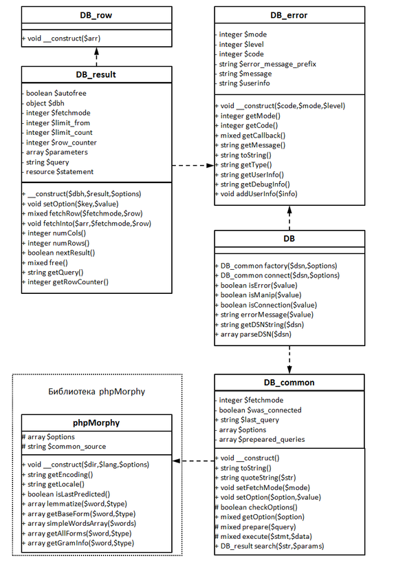 Поисковые методы объектов класса DB_common используют расширенный класс phpMorphy одноимённой библиотеки морфологического анализа, распространяемой бесплатно для некоммерческого использования. Методы phpMorphy позволяют решать следующие задачи: лемматизация (получение нормальной формы слова), получение всех форм слова, получение грамматической информации для слова (часть речи, падеж, спряжение и т. д.), изменение формы слова в соответствии с заданными грамматическими характеристиками, изменение формы слова по заданному образцу. Поддерживаемые в phpMorphy языки: русский, английский, немецкий, украинский, эстонский. Есть возможность добавить поддержку других языков. phpMorphy поддерживает все однобайтовые кодировки (windows-1251, iso-8859 и т. п.) и Unicode кодировки (utf-8, utf-16le/be, utf-32, ucs2, ucs4). По умолчанию библиотека работает с кодировкой UTF-8. phpMorphy использует для работы словарь. Поддерживаются словари AOT и myspell, свободно распространяемые, в том числе и для коммерческого использования. Словари представлены в двух видах: в исходном и бинарном. Исходный словарь представлен в виде XML файла и содержит основы слов, правила изменения и грамматическую информацию.