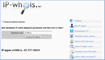 Определение IP адреса для доменного имени сайта с помощью сервиса ip-whois.net