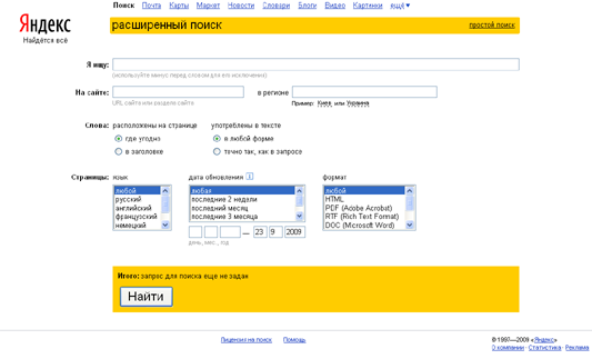 Яндекс позволяет решать сложные поисковые задачи, не пользуясь языком запросов. Для этого воспользуйтесь формой расширенного поиска, где сложные поисковые условия задаются в простой и наглядной форме.