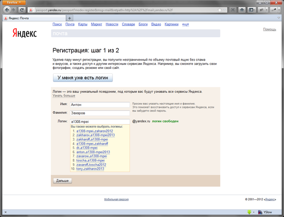 На первом шаге введём имя, фамилию и логин и кликнем «Дальше».