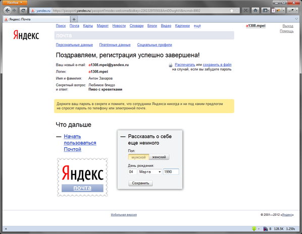 Зарегистрируем почтовый ящик на бесплатном сервисе «Яндекс.Почта».