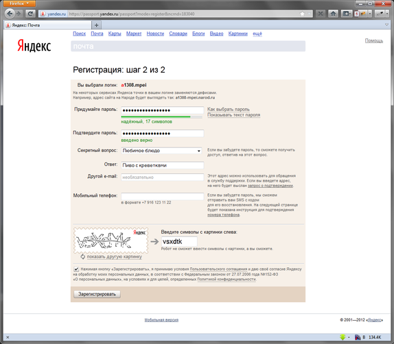 На втором шаге введём пароль, ответ на секретный вопрос и символы капчи. Кликнем «Зарегистрировать».