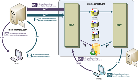 Посмотрим, что происходит при отправке почты. В нашем примере пользователь Иванов, находящийся в домене example.org (ivanov@example.org), пишет письмо Козлову в домен example.com (kozlov@example.com). Для Иванова процесс отправки почты состоит из создания сообщения и нажатия кнопки "Отправить" в почтовом клиенте. Почтовый клиент соединяется с МТА по протоколу SMTP и первым делом сообщает свои учетные данные. Авторизовав пользователя, MTA принимает сообщение и пытается доставить его дальше.