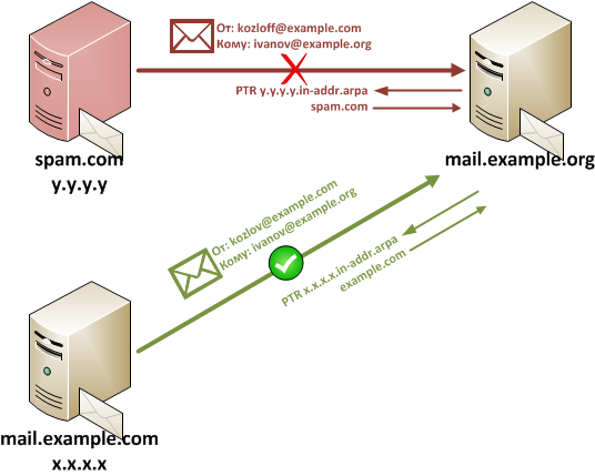 Рассмотрим пример более подробно. Некий спамерский сервер spam.com пытается рассылать письма с поддельным отправителем, якобы от известного нам сервера example.com. В случае фильтрации по белым/черным спискам такое письмо будет доставлено, так как отправителем числится пользователь из доверенного домена (на что и рассчитывали спамеры). В целях борьбы со спамом MTA формирует запрос PTR записи для IP-адреса отправляющего сервера, который он сообщает в процессе SMTP сессии. Для адреса y.y.y.y PTR-запрос вернет имя домена spam.com, которое не совпадает с доменом отправителя, что будет причиной отказа в приеме данного сообщения. В тоже время сообщения от сервера x.x.x.x будут получены, так как домен из PTR-записи для x.x.x.x (example.com) совпадает с доменом отправителя.