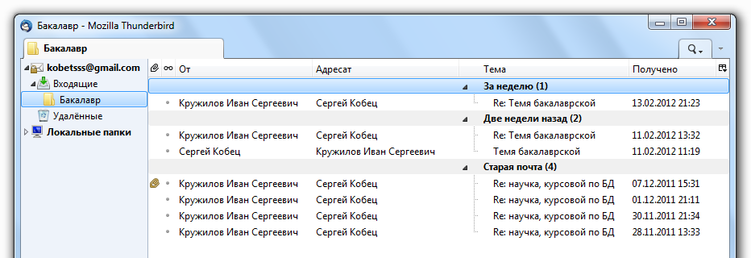 Был установлен и настроен почтовый клиент Mozilla Thunderbird v.10.0.2.