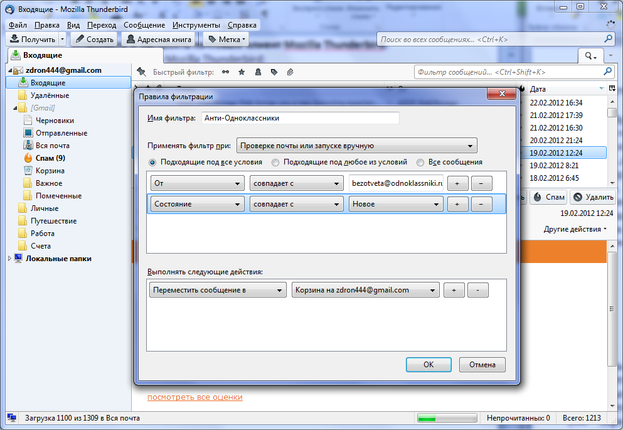 Выбрав сообщение автоматической рассылки от сервиса Одноклассники, можно через “создать фильтр” сделать для него правило, по которому оно будет перемещаться в Корзину: