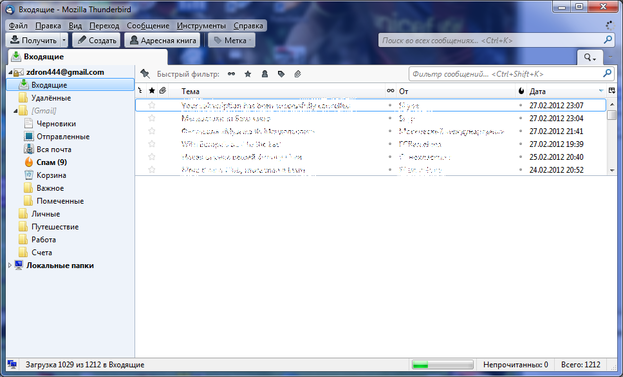 Папка Входящие в Mozilla Thunderbird: