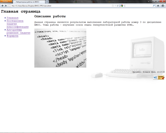 Данная страница является результатом выполнения лабораторной работы номер 3 по дисциплине ВМСС. Тема работы - изучение основ языка гипертекстовой разметки HTML.