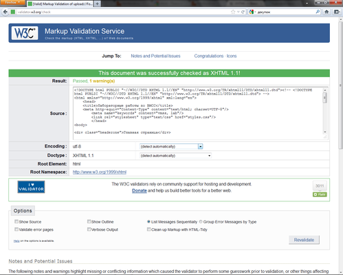 Приведем скриншот проверки на валидность главной страницы сайта: