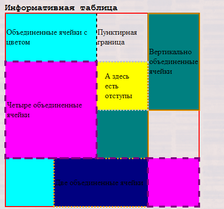 | Объединенные ячейки с цветом | Пунктирная граница | Вертикально объединенные ячейки | |