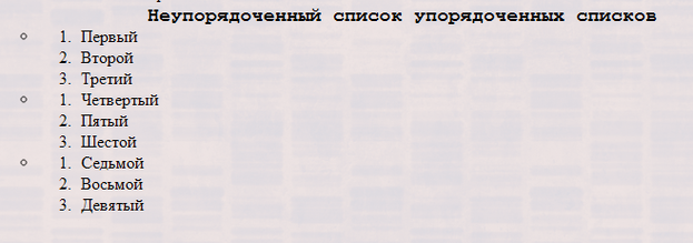 Разработать страницу, содержащую маркированный список нумерованных списков.
