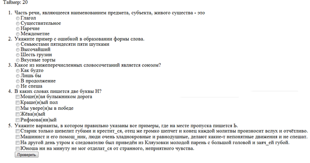 Разработать страницу для тестирования знаний (страницы содержат вопросы и варианты ответов, есть таймер для ограничения времени ответа).