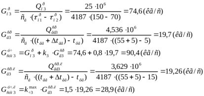 Таблица 3.6. Сводная таблица значений температур и расходов сетевой воды в подающем и обратном трубопроводах в зависимости от температуры наружного воздуха в третьей зоне: