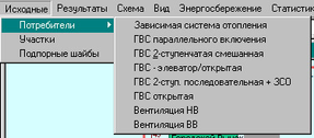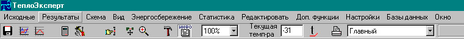 Главная панель управления состоит из набора кнопок, полей ввода, меню. В пункты меню вошли следующие разделы: Исходные, Результаты, Схема, Вид, Энергосбережение, Редактировать, Настройки, Базы данных, Окно, Справка. Некоторые пункты меню у вас могут отсутствовать – это определяется версией программы. Рассмотрим более подробно каждый пункт главного меню.