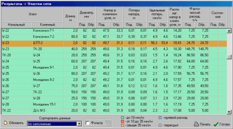 ыберете первый пункт – Участки. На экране появится новая форма со списком всех участков. Для каждого участка показывается вся информация по результатам расчета или наладки. Вся информация выводится в виде таблицы. Первые два столбика – это начальный и конечный узлы участка. Далее идет информация по длинам и диаметрам, а потом вся информация по результатам расчета. Информация отображается на разноцветных фонах. Каждому фону соответствует определенная удельная потеря напора. В нижней части формы есть расшифровка каждого цвета.